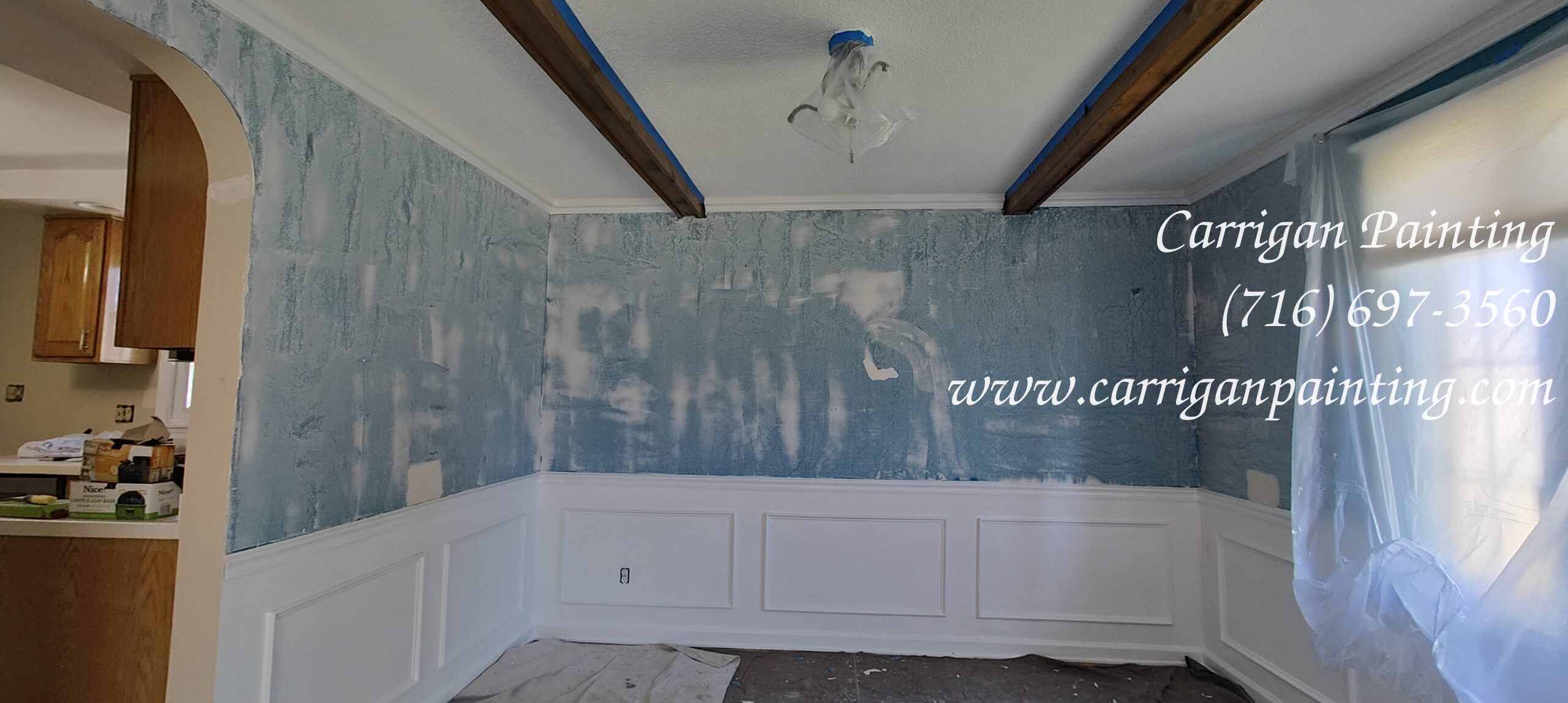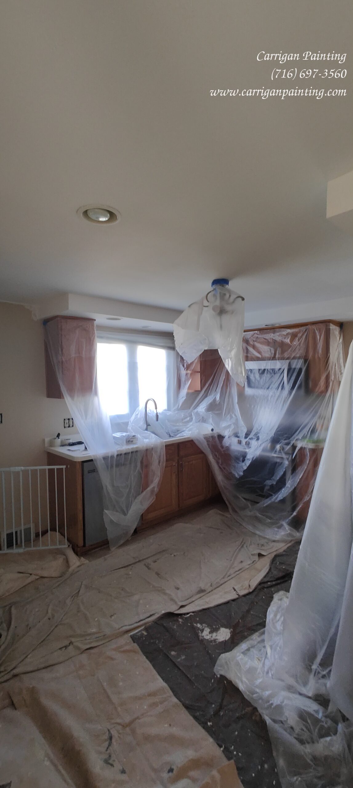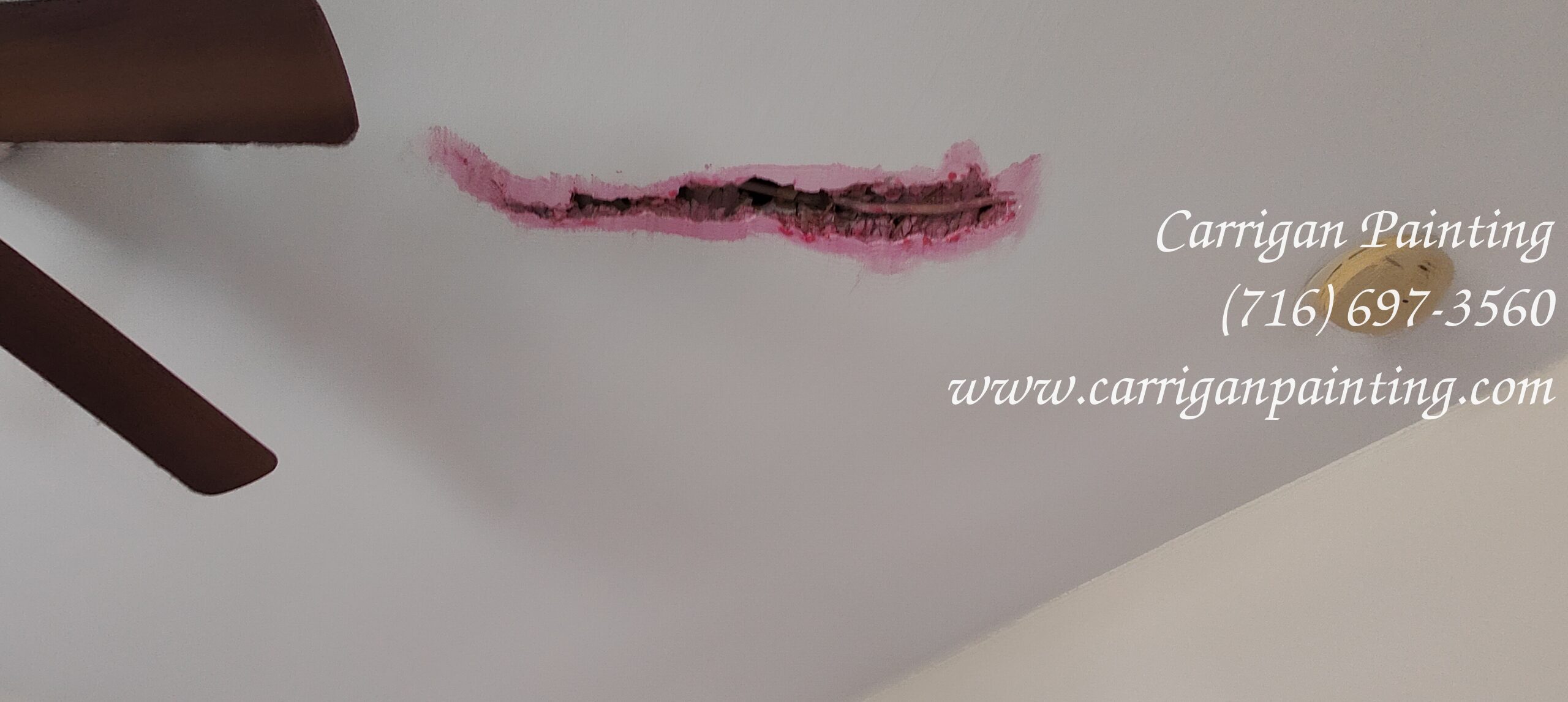 Once the floors are covered, the windows, cupboards ect are adequately covered, we begin by pole sanding the ceilings and walls. Then we start patching. Some times, this can be extensive as we discover more damage. We want to fix as much as we can prior to begin painting as that will give us the best possible finish.